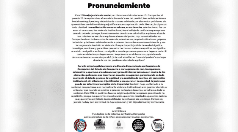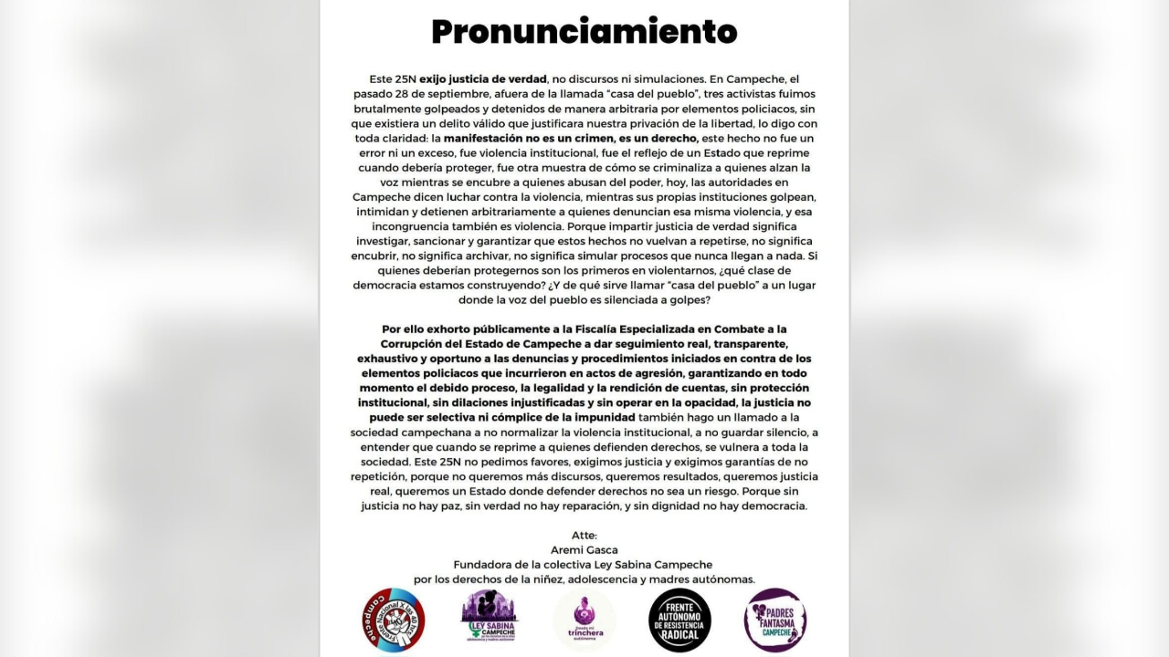 A través de un pronunciamiento público, Aremi Gasca criticó a las autoridades campechanas por asegurar que combaten la violencia cuando permiten que sus propias instituciones intimiden y repriman a quienes denuncian, y aseveró Impartir justicia de verdad significa investigar, sancionar y garantizar que estos hechos no vuelvan a repetirse, no significa encubrir ni simular procesos que nunca llegan a nada, enfatizó.
