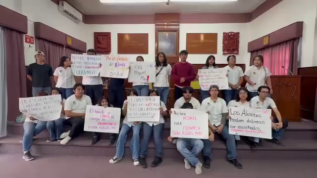 Mostrando pancartas con leyendas como “Fuera Miguel May!” y “Los alumnos también debemos ser escuchados”, recalcaron que seguir con sus actividades es necesaria la destitución, aunque sea temporal, de Miguel May, a quien acusan de presuntos abusos, hostigamiento, negligencia, ausentismo y de mantener un ambiente escolar hostil.