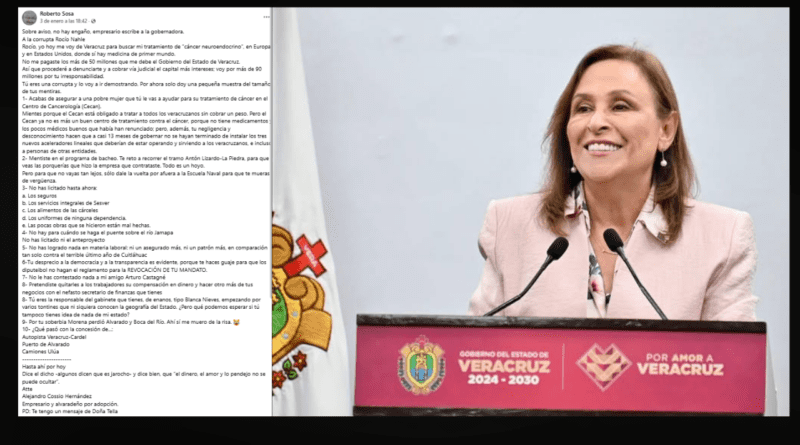 En sus redes sociales el periodista Roberto Sosa replicó un escrito del empresario Alejandro Cossío Hernández dirigido a la gobernadora Rocío Nahle, a quien tacha de corrupta y acusa de no pagarle más de 50 millones de pesos que le adeuda el Gobierno de Veracruz, por lo cual la denunciará para cobrarle el capital más intereses por la vía judicial, le aclara que se va de la entidad en busca de tratamiento “cáncer neuroendocrino”, en Europa y Estados Unidos, “donde sí hay medicina de primer mundo”, y le expone más de 10 puntos que, resume, son “una pequeña muestra del tamaño de tus mentiras”.