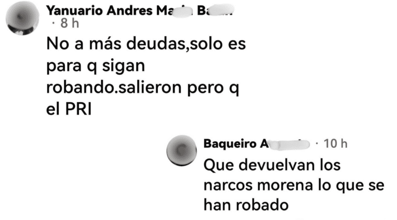 Los señalamientos fueron directos: “Total, ya se van, le quedan 2 años y ya empiezan a llenar las maletas. Todos los políticos de todos los partidos son lo mismo”, “Y si no hay dinero para qué va a hacer sus Posadas del jaguar, que ocupe el dinero para medicamentos, educación, campo, etc.”, “O sea, es para su retiro, que primero clarifique en qué posiblemente lo ocupe y si queremos que se ejecute, porque para trabajos inútiles ya tenemos suficiente”, y “No a más deudas, sólo es para que sigan robando, salieron peor que el PRI”.