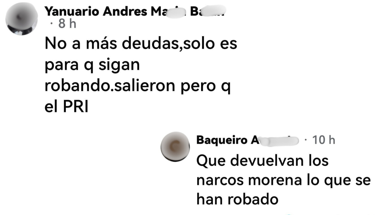 Los señalamientos fueron directos: “Total, ya se van, le quedan 2 años y ya empiezan a llenar las maletas. Todos los políticos de todos los partidos son lo mismo”, “Y si no hay dinero para qué va a hacer sus Posadas del jaguar, que ocupe el dinero para medicamentos, educación, campo, etc.”, “O sea, es para su retiro, que primero clarifique en qué posiblemente lo ocupe y si queremos que se ejecute, porque para trabajos inútiles ya tenemos suficiente”, y “No a más deudas, sólo es para que sigan robando, salieron peor que el PRI”.