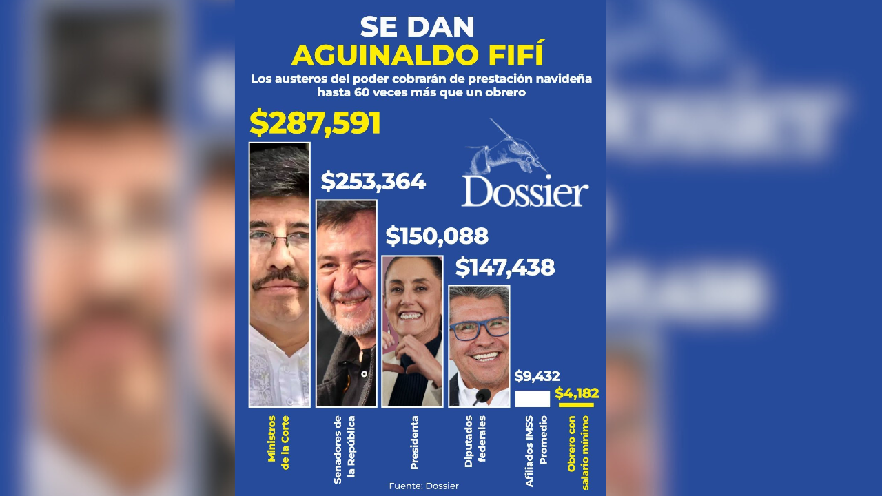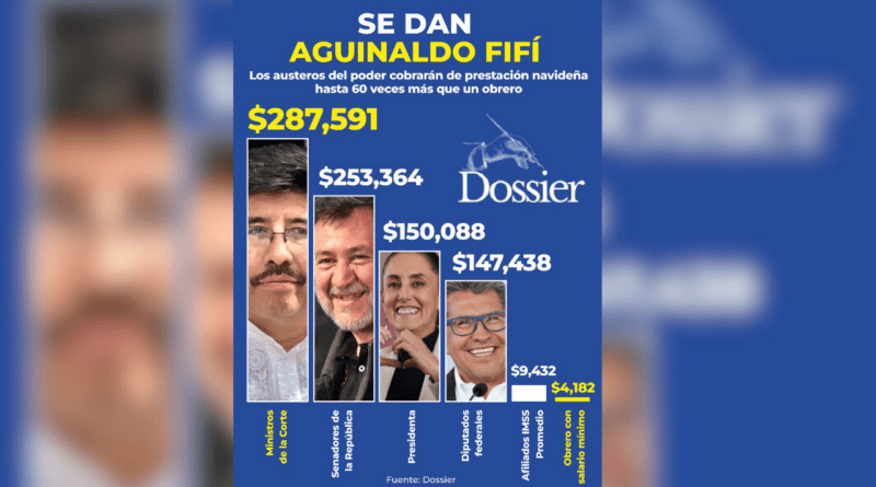 Los políticos morenistas en las principales posiciones de poder “olvidaron” una vez más la pobreza franciscana, la austeridad, la carestía y el desempleo, y se autorizaron aguinaldos que representan en algunos casos hasta 60 veces más de lo que cobrará un obrero, pues, por ejemplo, los ministros de la Suprema Corte de Justicia de la Nación (SCJN) recibirán 287 mil 591 pesos, los senadores 253 mil 364 y la presidenta Claudia Sheinbaum150 mil 088, mientras un trabajador con salario mínimo obtendrá 4 mil 182 pesos, de acuerdo con una publicación Dossier.