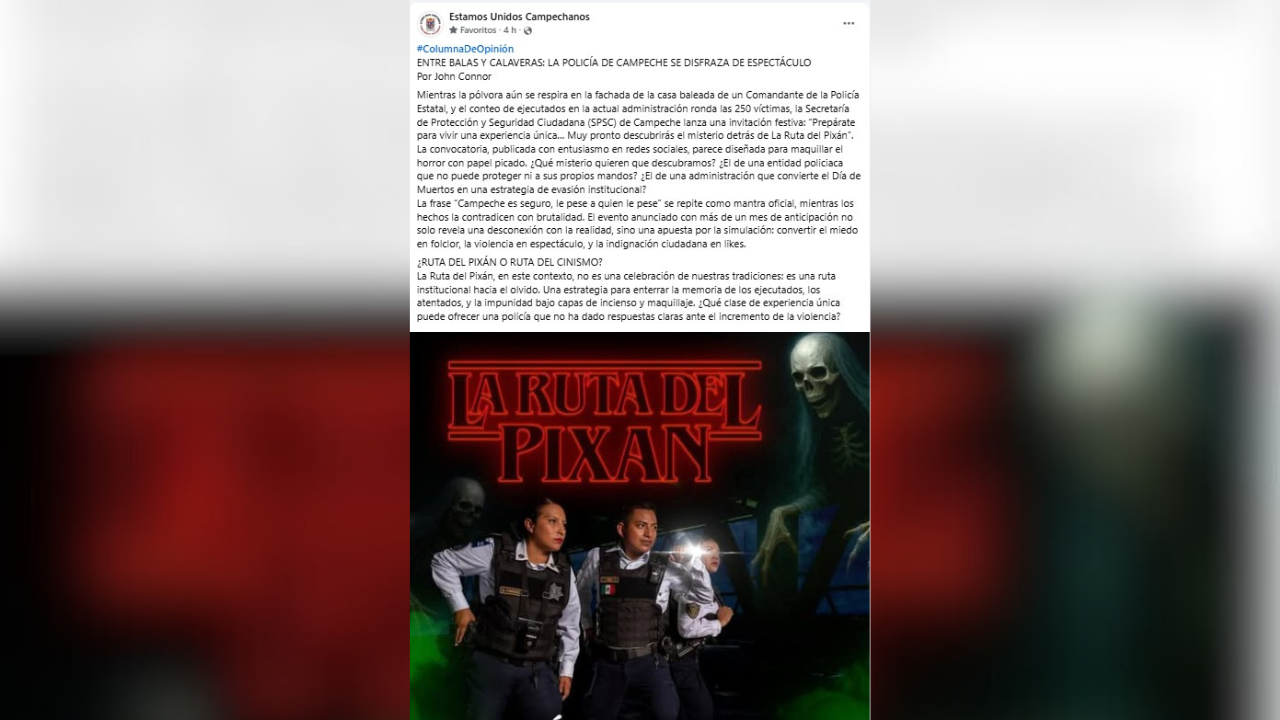Por medio de sus redes sociales, la página Estamos Unidos Campechanos replica un texto firmado por John Connor, quien critica que mientras el número de ejecutados ronda los 250 en la actual Administración, la Secretaría de Protección y Seguridad Ciudadana (SPSC) invita a prepararse para “vivir una experiencia única para descubrir el misterio detrás de La Ruta del Pixán”, con lo cual intenta maquillar el horror con papel picado, y pregunta si el misterio es el de una entidad policiaca que no puede proteger ni a sus propios mandos.