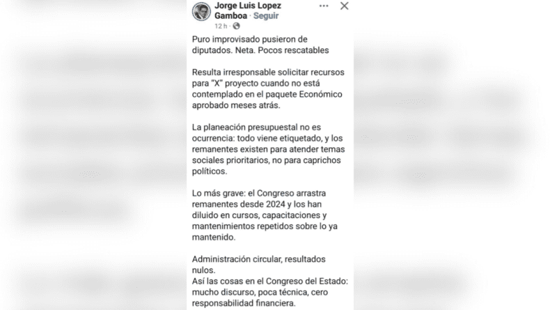 Calificó como irresponsable solicitar recursos para “X” proyecto cuando no está contemplado en el Paquete Económico aprobado meses atrás, mismo que no es ocurrencia, pues todo viene etiquetado y los remanentes existen para atender temas sociales prioritarios, no para caprichos políticos. López Gamboa aseguró que desde el 2024 el Congreso arrastra remanentes y los han asignado a cursos, capacitaciones y mantenimientos repetidos sobre lo ya mantenido. “Mucho discurso, poca técnica y cero responsabilidad financiera”, agregó.