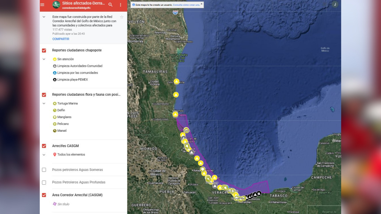 Mientras aún no se sabe quién fue el responsable del derrame, la mancha de hidrocarburo va de Tabasco hasta Veracruz y Tamaulipas, es decir, 93 kilómetros del Golfo de México, de acuerdo con la Red Corredor Arrecifal del Golfo de México, que también reportó 96 sitios con presencia de chapopote, de los cuales 55 siguen sin atención.