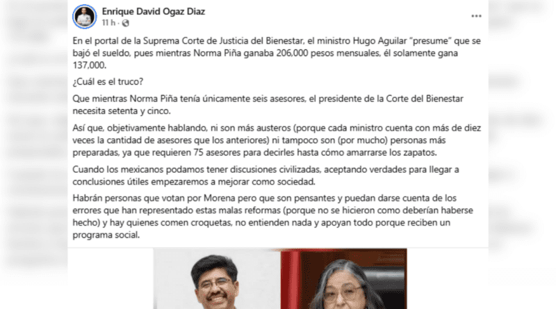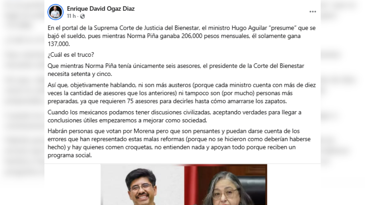 En una publicación en sus redes sociales, el especialista en derecho penal económico Enrique Ogaz Díaz, revela que en el portal de la Suprema Corte de Justicia del Bienestar, el ministro Hugo Aguilar informa que se bajó el sueldo, pues sólo gana 137 mil pesos mensuales contra los 206 mil de Norma Piña, sin embargo, él necesita 75 asesores mientras la exministra sólo tenía 6.