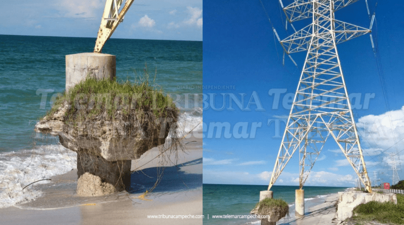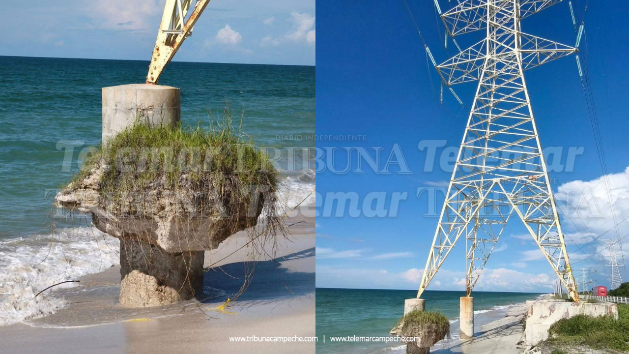 Debido a que la erosión costera sigue afectando gravemente la infraestructura en el tramo carretero Isla Aguada–Sabancuy, una torre de alta tensión de la Comisión Federal de Electricidad (CFE) está en estado crítico, con sus bases expuestas y debilitadas.