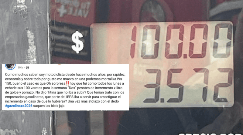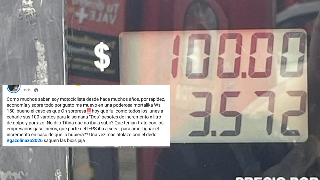 A través de sus redes sociales, un cibernauta que se moviliza en motocicleta denunció que al ir a la gasolinería se topó con el sorpresivo incremento de 2 pesos por litro “de golpe y porrazo”, y cuestionó: “¿No que había trato federal con los empresarios gasolineros para que no hubiera incremento, y que parte del IEPS iba servir para amortiguar el aumento en caso que hubiera?”.