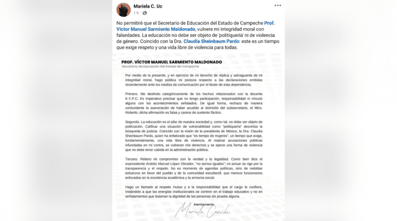 Luego de que el secretario estatal de Educación, Víctor Sarmiento Maldonado, aseguró que la denuncia de una madre de familia y una profesora contra 2 docentes de la Escuela Primaria “Ángel Castillo Lanz”, ubicada en Dzitbalché, ante la Comisión de Derechos Humanos del Estado de Campeche (Codhecam) fue “politiquería” por la intrusión de la esposa del alcalde de MOCI de ese Municipio, Luis Chan Puc, pues también fueron a la casa del subsecretario de Educación Básica, Roberto Herrera Maas, en horarios de descanso para exigirle su intervención, la señalada, Mariela C. Uc, le respondió en sus redes sociales: “Su afirmación es falsa y carece de sustento… Con sus acusaciones se vulneran mis derechos y se ejerce violencia en mi contra”.