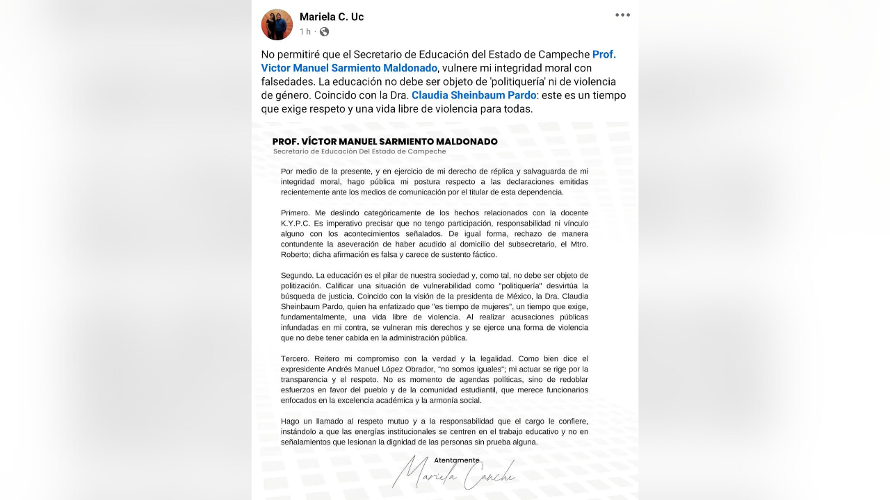 Y advirtió: “…Calificar una situación de vulnerabilidad como ‘politiquería’ desvirtúa la búsqueda de justicia… No permitiré que el secretario de Educación del Estado de Campeche, Prof. Víctor Manuel Sarmiento Maldonado, vulnere mi integridad moral con falsedades. La educación no debe ser objeto de ‘politiquería’ ni de violencia de género. Coincido con la Dra. Claudia Sheinbaum Pardo: este es un tiempo que exige respeto y una vida libre de violencia para todas”.