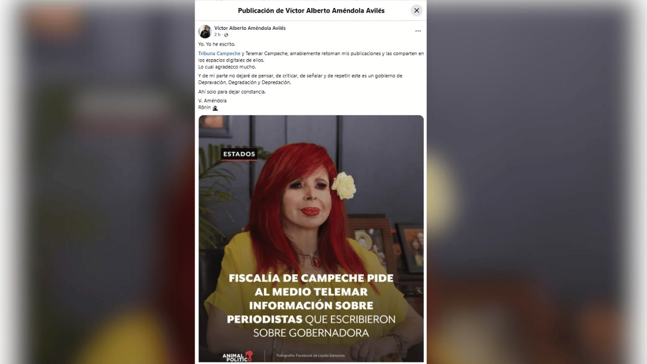 El exdirigente perredista refirió: “Yo. Yo he escrito. Tribuna Campeche y Telemar Campeche, amablemente retoman mis publicaciones y las comparten en los espacios digitales de ellos. Lo cual agradezco mucho. Y de mi parte no dejaré de pensar, de criticar, de señalar y de repetir: este es un Gobierno de Depravación, Degradación y Depredación. Ahí sólo para dejar constancia. V. Améndola”.