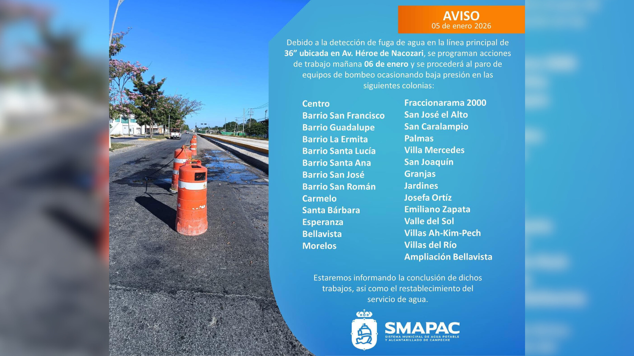 San Francisco de Campeche.- Por una fuga en la línea principal de 36 pulgadas ubicada en la avenida Héroe de Nacozari, se programaron trabajos de reparación en dicho punto.