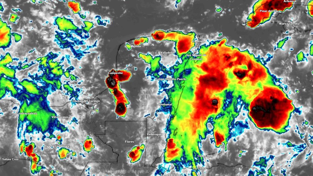 De acuerdo con los pronósticos, durante la tarde y la noche de hoy se presentarán tormentas muy fuertes dispersas a intensas aisladas en el 70% del estado de Yucatán, 90% de Campeche y 40% de Quintana Roo. En el resto de la región se esperan tormentas moderadas dispersas, sin descartar valores puntuales fuertes.