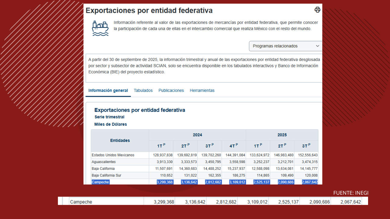 EXPORTACIONES DE CAMPECHE CAEN MÁS DE 2 MIL 500 MILLONES DE DÓLARES, REPORTA EL INEGI