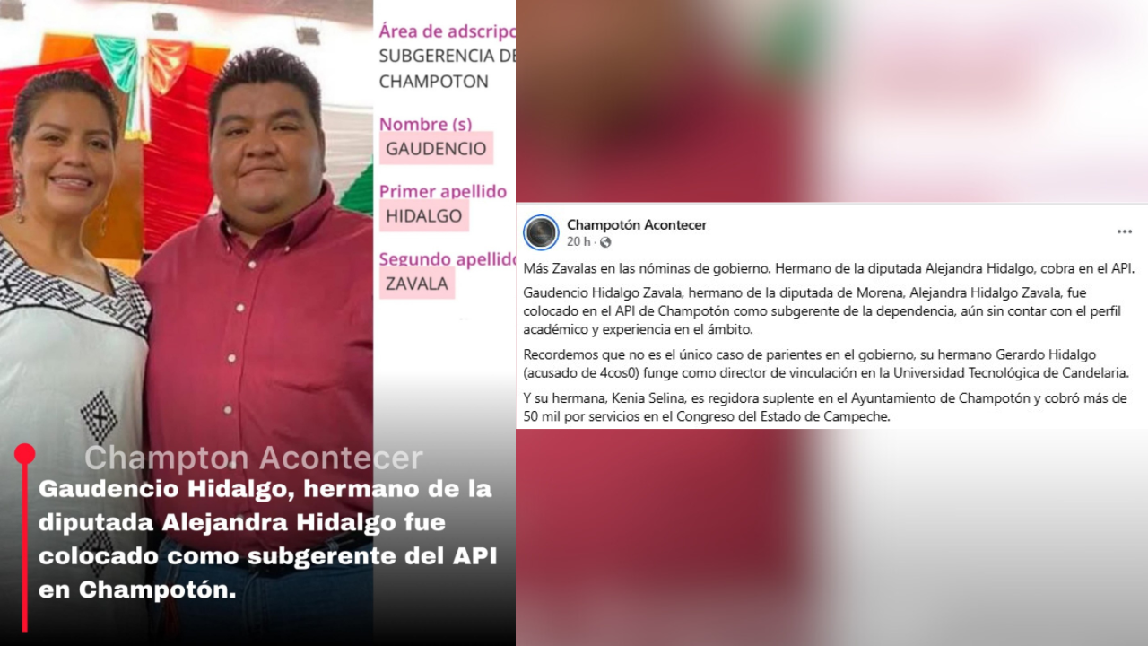 A través de una publicación en sus redes sociales, la página Champotón Acontecer dio a conocer que parientes, entre ellos su hermano Gerardo, de la diputada de Morena, Alejandra Hidalgo Zavala, han encontrado acomodo en nóminas del Gobierno, como la Administración Portuaria Integral de la Bahía de la Mala Pelea.