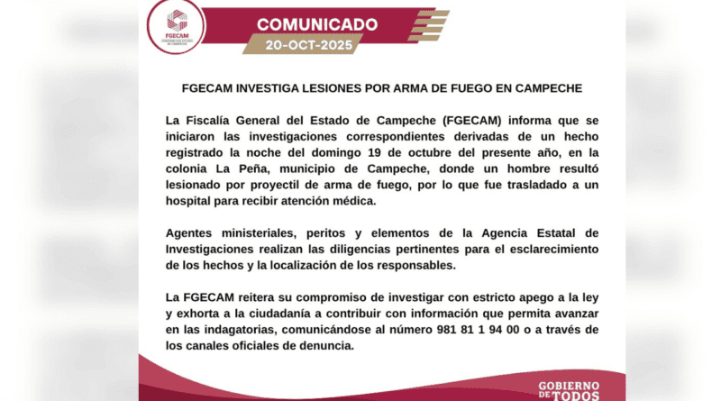 Campeche.- La Fiscalía General del Estado de Campeche (FGECAM) confirmó que un hombre resultó lesionado por proyectil de arma de fuego en un hecho ocurrido la noche del domingo 19 de octubre en la colonia La Peña, La víctima fue trasladada a un hospital para recibir atención médica.