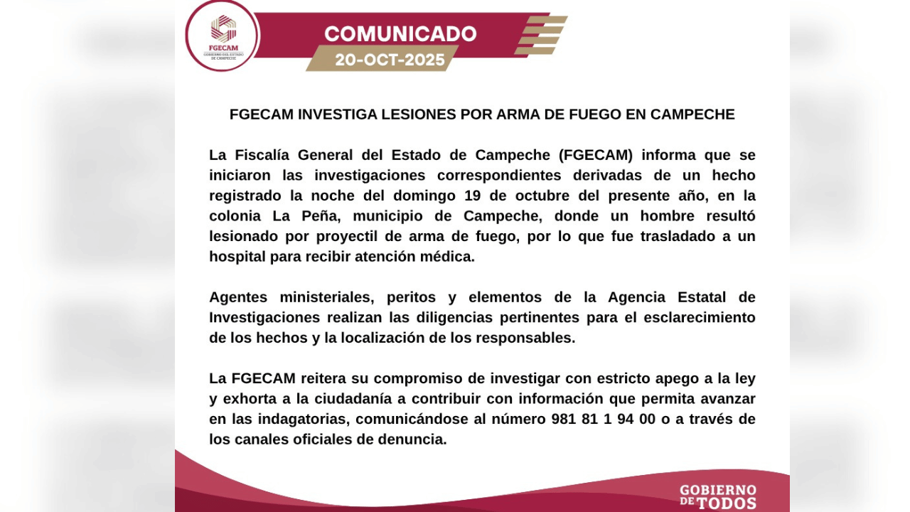 Campeche.- La Fiscalía General del Estado de Campeche (FGECAM) confirmó que un hombre resultó lesionado por proyectil de arma de fuego en un hecho ocurrido la noche del domingo 19 de octubre en la colonia La Peña, La víctima fue trasladada a un hospital para recibir atención médica.