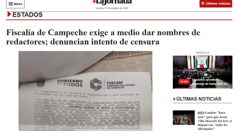 FISCALÍA DE CAMPECHE EXIGE A MEDIO DAR NOMBRES DE REDACTORES; DENUNCIAN INTENTO DE CENSURA: LA JORNADA