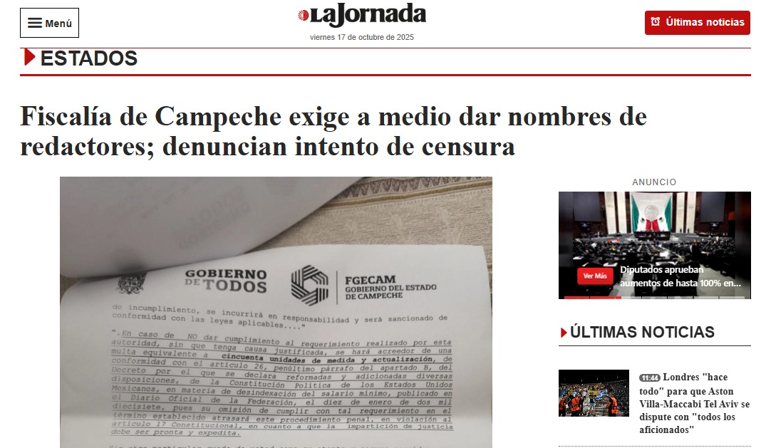 FISCALÍA DE CAMPECHE EXIGE A MEDIO DAR NOMBRES DE REDACTORES; DENUNCIAN INTENTO DE CENSURA: LA JORNADA
