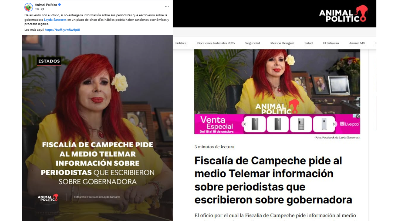 En una publicación en sus redes sociales, el sitio web de noticias y medios de comunicación denominado Animal Político replicó la solicitud de la Fiscalía General del Estado de Campeche a Producciones Telemar, y que “de acuerdo con el oficio, si no entrega la información sobre sus periodistas que escribieron sobre la gobernadora Layda Sansores, en un plazo de 5 días hábiles, podría haber sanciones económicas y procesos legales.