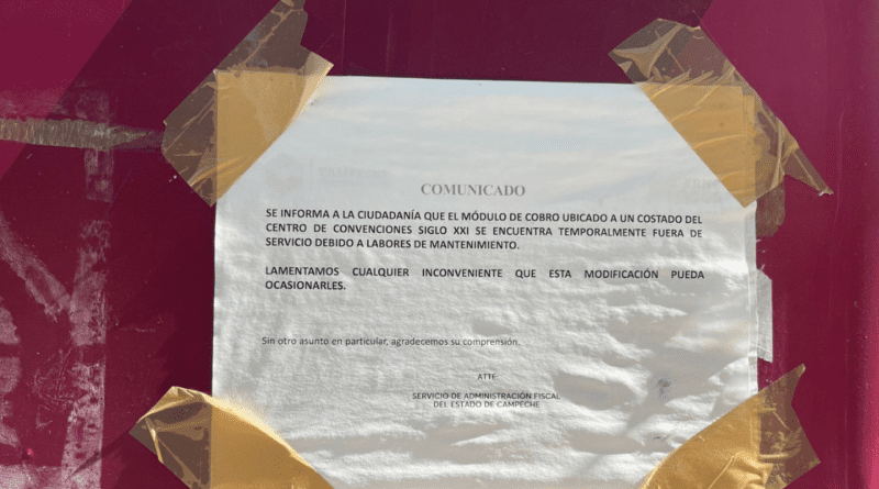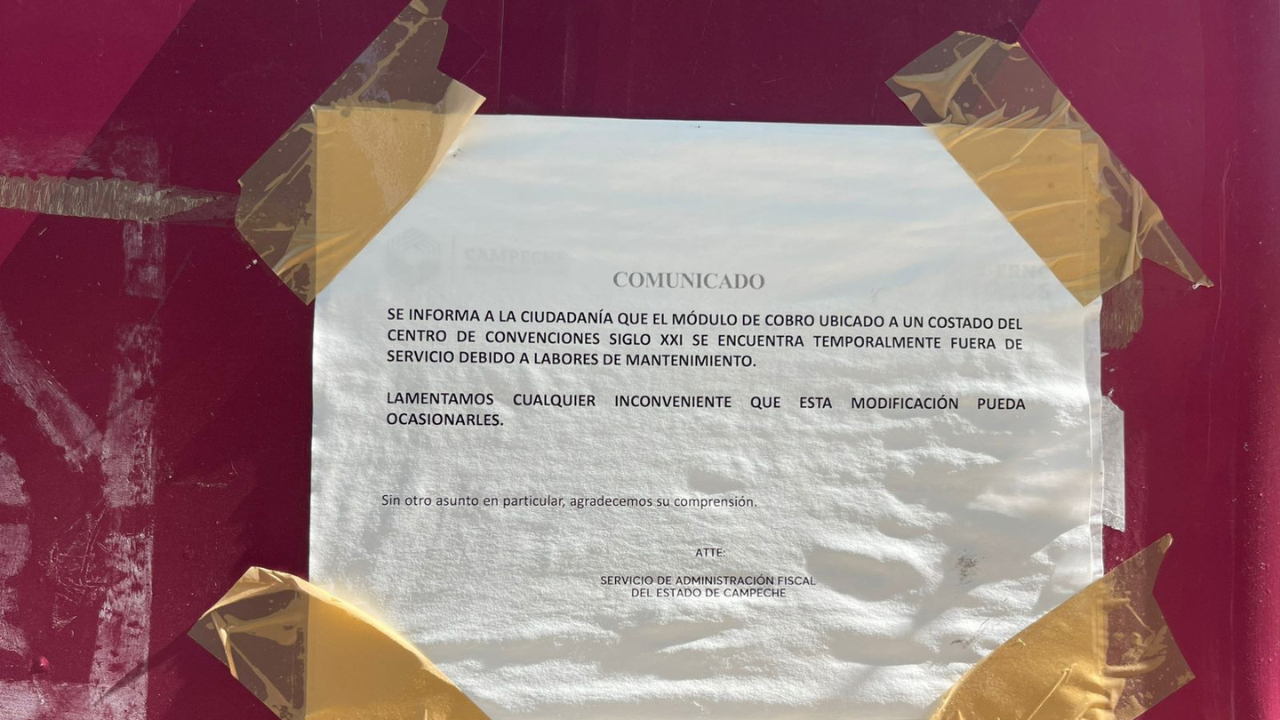El Servicio de Administración Fiscal del Estado de Campeche informó que el módulo de cobro ubicado a un costado del Centro de Convenciones Siglo XXI se encuentra temporalmente fuera de servicio debido a labores de mantenimiento.