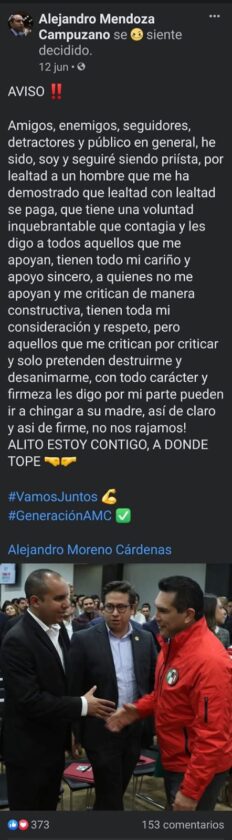 Mendoza Campuzano fue durante años militante del PRI y afín al hoy dirigente nacional tricolor Alejandro “Alito” Moreno, y en el 2024 apareció como candidato a regidor en la planilla Jorge Chanona, abanderado del PAN. ¿Ya lo purificó Morena?