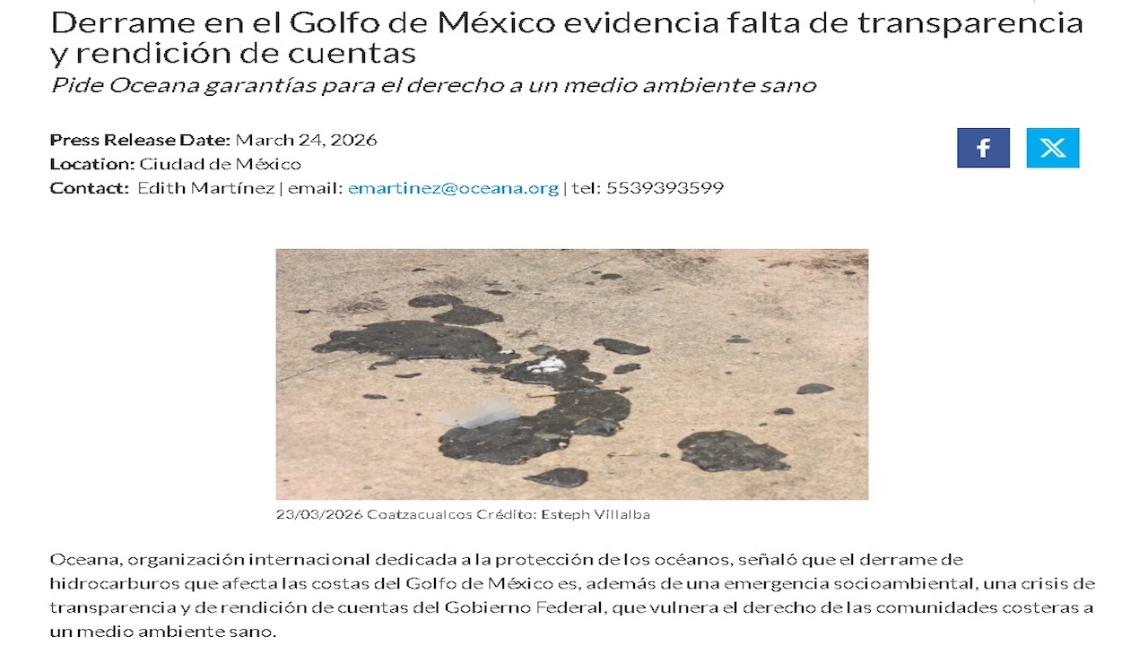 Oceana, organización internacional dedicada a la protección de los océanos, difundió un comunicado donde señala que “casi 20 días del primer reporte de chapopote en las costas del sur de Veracruz y del norte de Tabasco, la autoridad no ha podido establecer la causa del derrame ni identificar responsables, mientras la información oficial sigue siendo contradictoria e insuficiente ante la magnitud del daño señalado por las comunidades”.