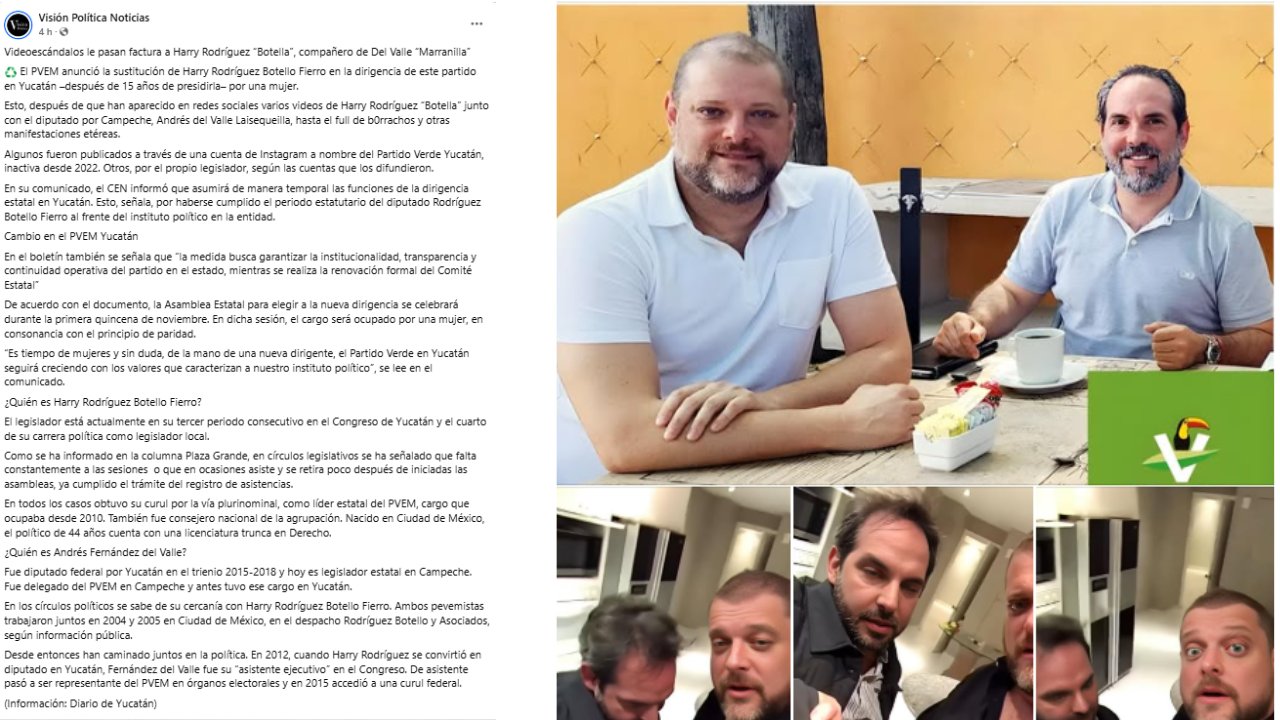 Tras la publicación en redes sociales de varios videos donde aparece con el diputado por Campeche, Andrés “Marranilla” del Valle Laisequeilla, visiblemente bajo los influjos del alcohol, el legislador Harry “Botella” Rodríguez Botello Fierro fue sustituido de la dirigencia estatal del Partido Verde Ecologista de México (PVEM), tras 15 años de presidirla, por una mujer.