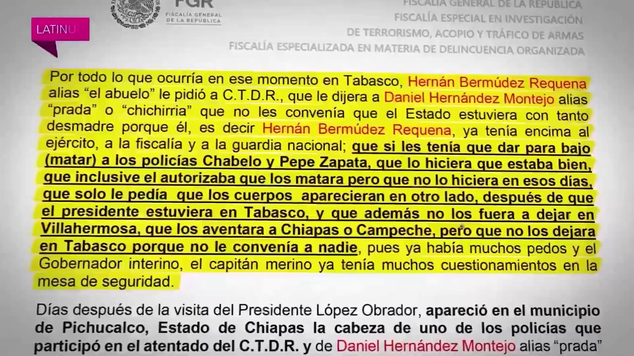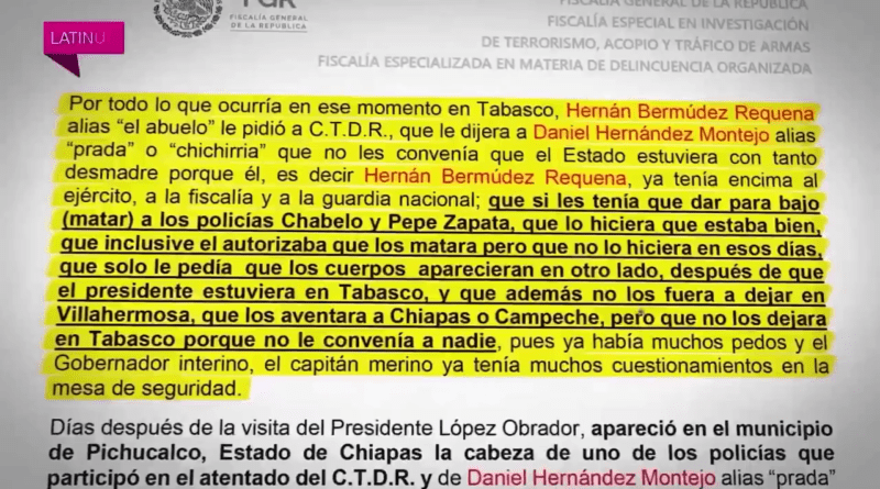 Al recalcar que la salida de Hernán Bermúdez de la Secretaría de Seguridad de Tabasco no fue por sus vínculos criminales, sino por haber arruinado las vacaciones de AMLO en 2023 con la ola de violencia, en su programa en Latinus el periodista Carlos Loret de Mola reveló que, de acuerdo con el expediente de la FGR, el hoy detenido autorizó el asesinato de dos policías, cuyos cuerpos pidió tirar en Chiapas o Campeche.
