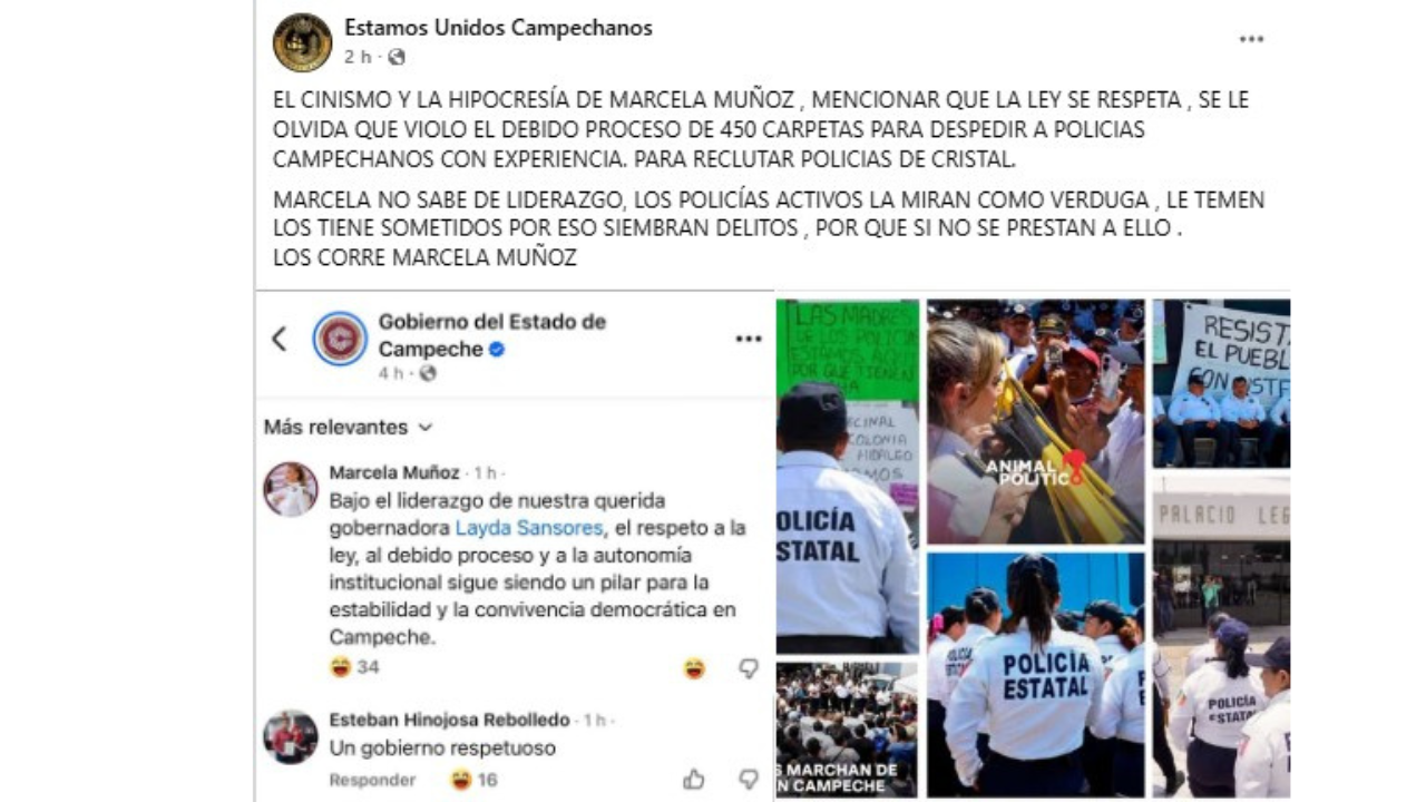 La página señala que Marcela Muñoz habría integrado al menos 450 carpetas administrativas para justificar el despido de policías campechanos con experiencia, lo que derivó en su salida y sustitución por personal sin trayectoria operativa.