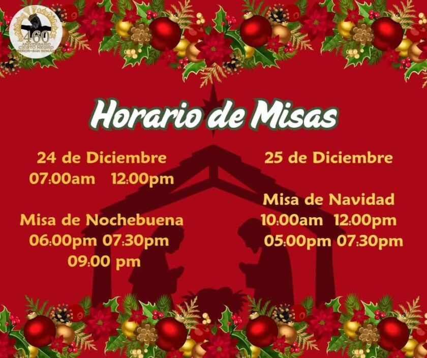 Para el lunes 25, la capilla Gran Poder de Dios celebrará a las 12:30 p.m., mientras en la Parroquia habrá misa a las 7:00 de la noche.