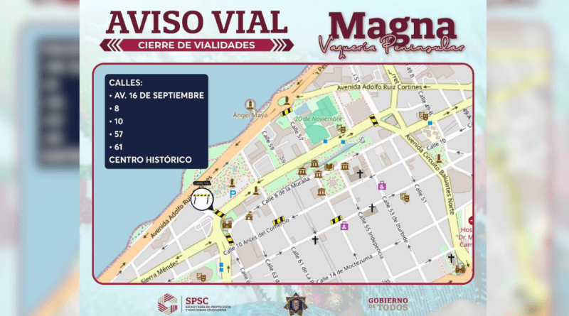 A través de un comunicado, las autoridades estatales dieron a conocer que por la Magna Vaquería Peninsular, hoy sábado 11 de octubre a las 4 de la madrugada fueron cerradas 5 vialidades en el Centro Histórico: la avenida 16 de Septiembre y las calles 8, 10, 57 y 61.