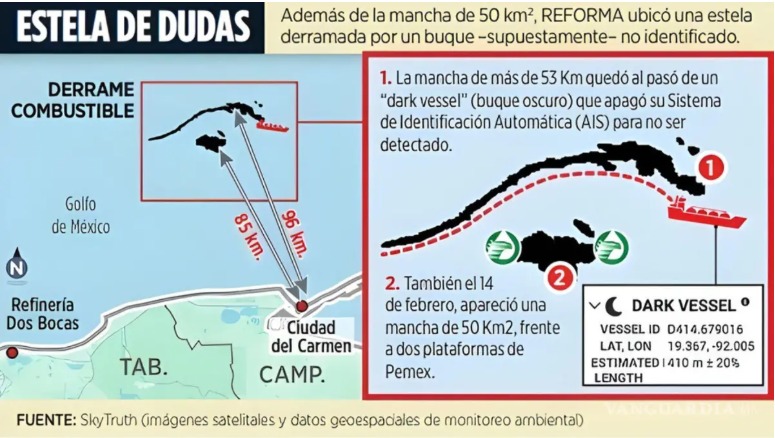Un buque con su sistema de identificación automática (AIS) apagado fue detectado en la Sonda de Campeche junto a un derrame extendido de hidrocarburos, según imágenes satelitales de la plataforma SkyTruth, y de acuerdo con especialistas y trabajadores de Pemex, este comportamiento coincide con prácticas ilegales utilizadas para el robo de combustible, pues estas embarcaciones operan “a oscuras” para evitar ser rastreadas, publicó el medio Vanguardia, basado en información del diario Reforma.