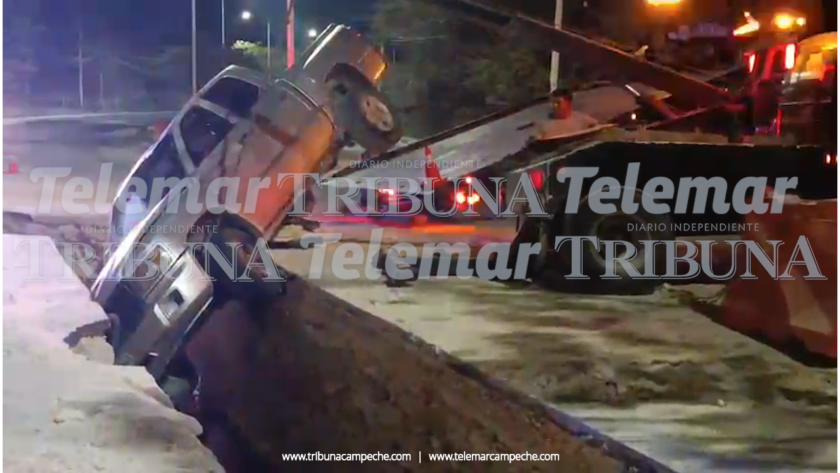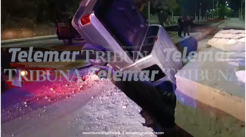 San Francisco de Campeche.- Una camioneta terminó dentro de una excavación la madrugada de este domingo sobre la avenida López Portillo, a la altura del cárcamo del SMAPAC.