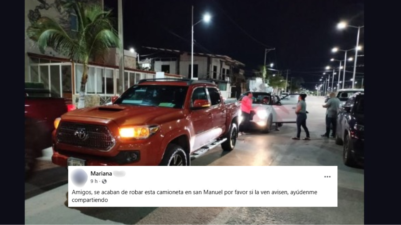 A través de sus redes sociales, la usuaria Mariana V. precisó que el hurto ocurrió en San Manuel y pidió de favor a los cibernautas que le avisen si ven el vehículo y que la ayuden compartiendo la denuncia.