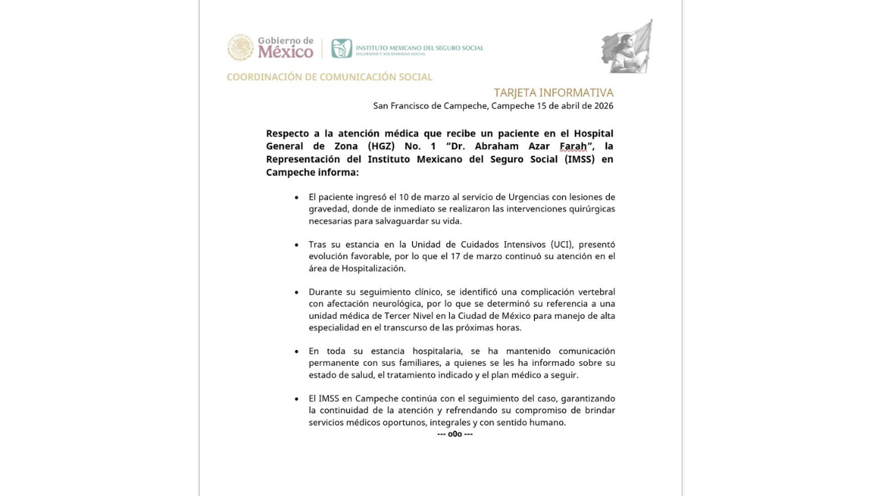 San Francisco de Campeche.- Por medio de un comunicado, el Instituto Mexicano del Seguro Social (IMSS) en Campeche informó que por una complicación a nivel vertebral con afectación neurológica, determinó referir a una unidad médica de Tercer Nivel en la Ciudad de México para recibir atención de alta especialidad, a un paciente ingresado el pasado 10 de marzo con lesiones graves en el Hospital General de Zona No. 1 “Dr. Abraham Azar Farah”.