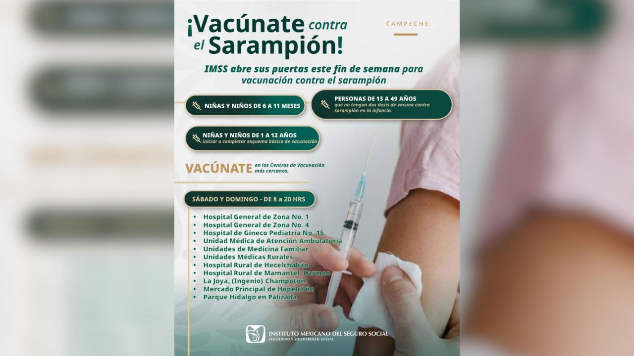 El Instituto Mexicano del Seguro Social en Campeche informó a través de su cuenta oficial de Facebook que este fin de semana se llevará a cabo una jornada especial de vacunación contra el sarampión en la entidad.