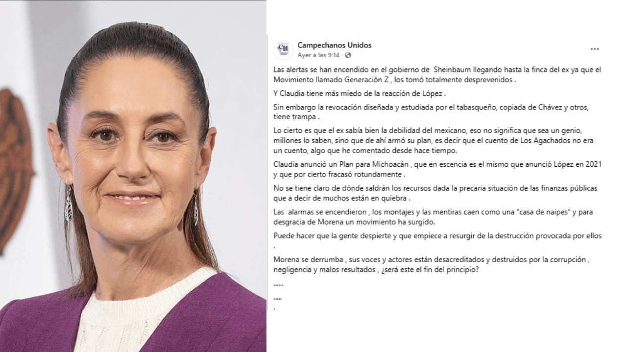 Mediante una publicación divulgada en sus redes sociales, Campechanos Unidos expuso que el surgimiento del movimiento Generación Z asestó un duro y sorpresivo golpe a la 4T, en momentos en que Morena se derrumba, lo que ha encendido las alarmas en la Administración de Claudia Sheinbaum hasta llegar a la finca de AMLO, ante lo cual los mexicanos podrían despertar y resurgir de la destrucción provocada por el sistema.