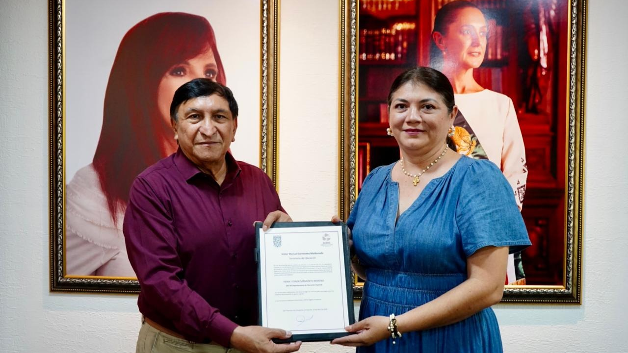 San Francisco de Campeche.- A través de la página oficial de la Secretaría de Educación, su titular Víctor Manuel Sarmiento Maldonado, entregó a nombre de la gobernadora el nombramiento a Reina Leonor Sarmiento Moreno como nueva jefa del Departamento de Educación Especial.