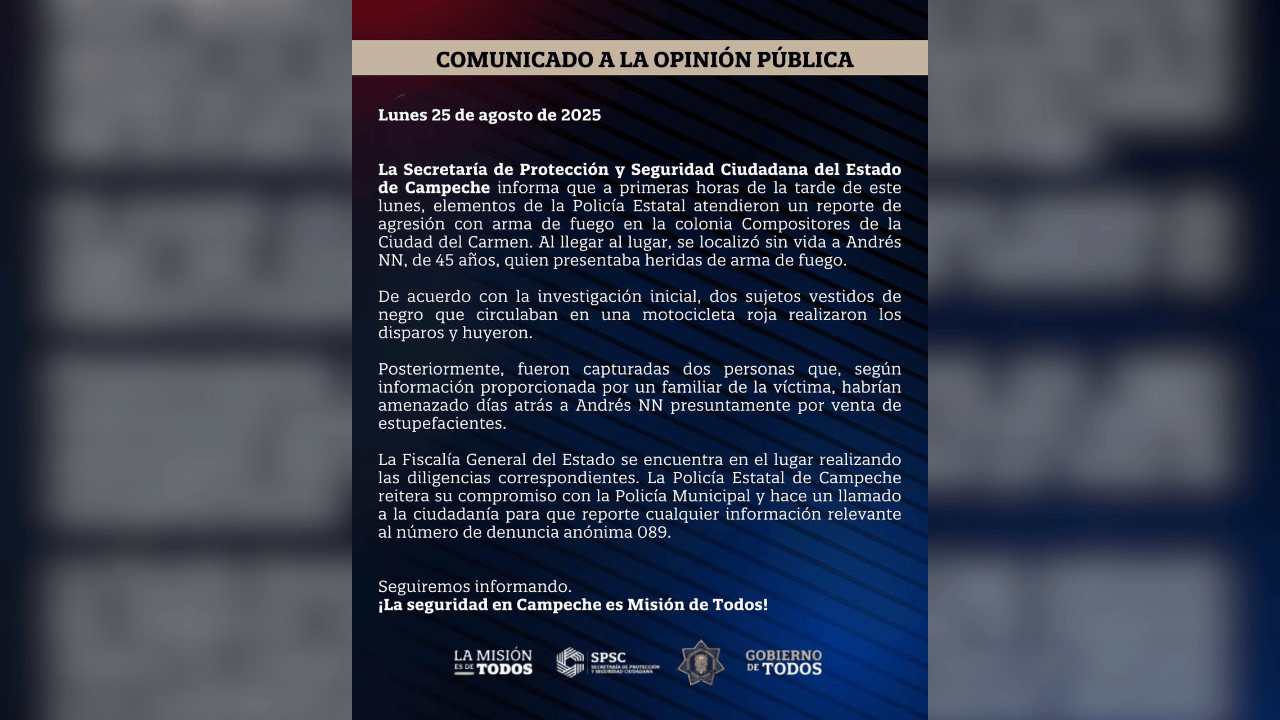 Mediante un boletín, la Secretaría de Protección y Seguridad Ciudadana (SPSC) confirmó que la tarde de hoy lunes 25 de agosto atendió reporte de “Agresión con arma de fuego” en la colonia Compositores, donde encontró a Andrés “N” sin vida y con heridas de bala.