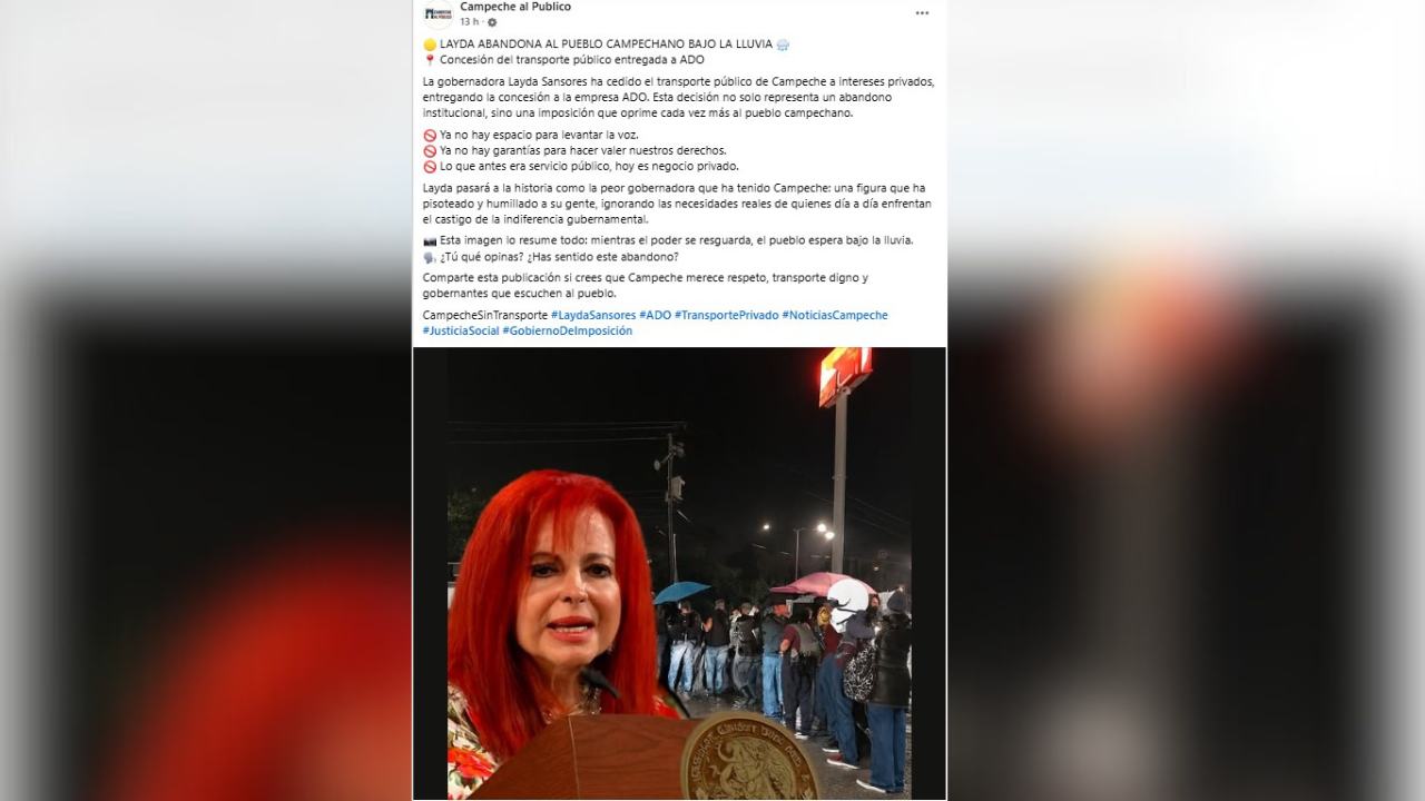 El texto de Campeche al Público dice: “Concesión del transporte público entregada a ADO. La gobernadora Layda Sansores ha cedido el transporte público de Campeche a intereses privados, entregando la concesión a la empresa ADO. Esta decisión no solo representa un abandono institucional, sino una imposición que oprime cada vez más al pueblo campechano. Ya no hay espacio para levantar la voz. Ya no hay garantías para hacer valer nuestros derechos. Lo que antes era servicio público, hoy es negocio privado”.