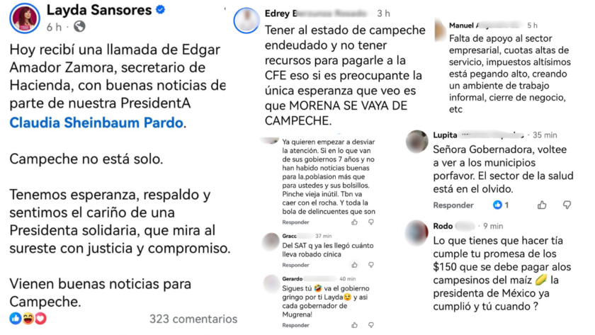 El hastío ciudadano ante la falta de resultados del Gobierno laydista lo demostró un usuario al escribir: “Tener al Estado de Campeche endeudado y no tener recursos para pagarle a la CFE, eso sí es preocupante; la única esperanza que veo es que Morena se vaya”, uno más aseveró: “Del SAT que ya les llegó cuánto lleva robado cínica”, y otro criticó: “Después de desviar recursos, chingarse los impuestos de Campeche y censurar a periodistas, ahora pide ayuda”.