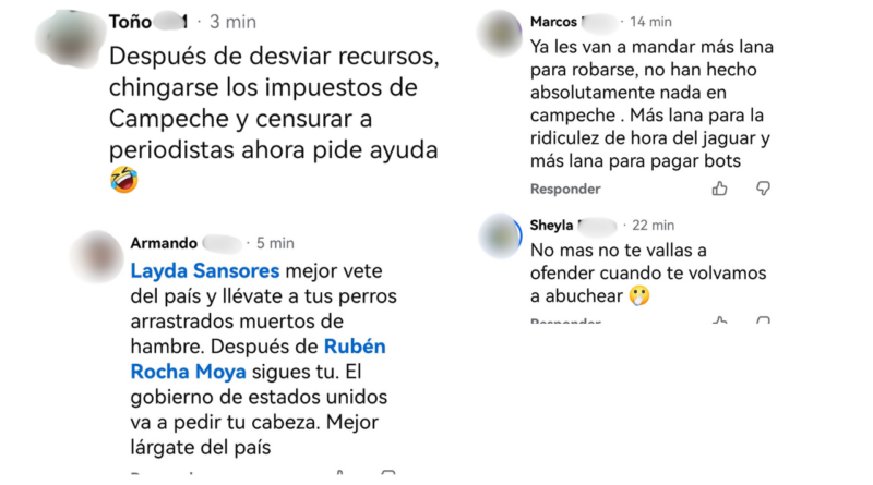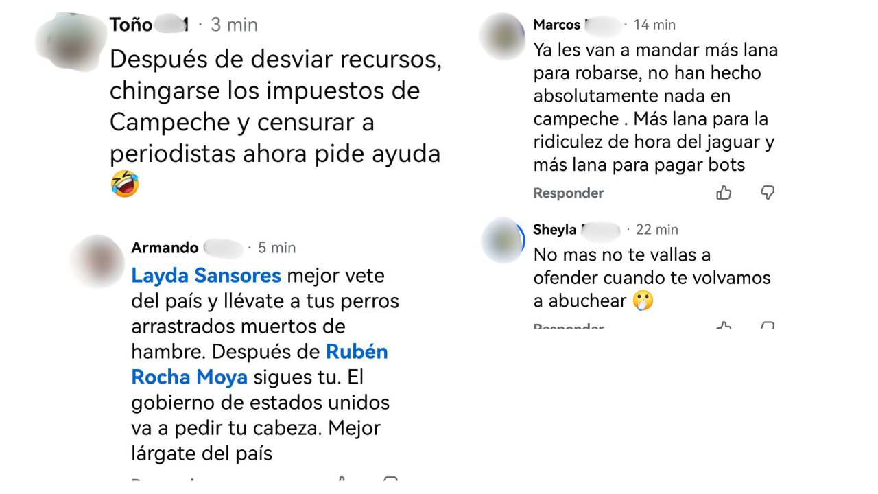 Circula en Redes.- “Layda, mejor vete del país… Después de Rubén Rocha Moya sigues tú…”, “Ya quiere empezar a desviar la atención. Si en lo que va de sus gobiernos 7 años y no ha habido noticias buenas para la población, sólo para ustedes y sus bolsillos. Pinche vieja inútil. También va a caer con el Rocha y toda la bola de delincuentes que son”, y “Ya les van a mandar más lana para robarse, no han hecho absolutamente nada en Campeche. Más lana para la ridiculez de hora del jaguar y para pagar a los bots”, respondieron cibernautas al anuncio de la gobernadora de que el Gobierno Federal respaldará a la entidad ante la crisis financiera, y de que “vienen buenas noticias de la presidenta Claudia Sheinbaum”.