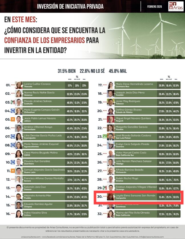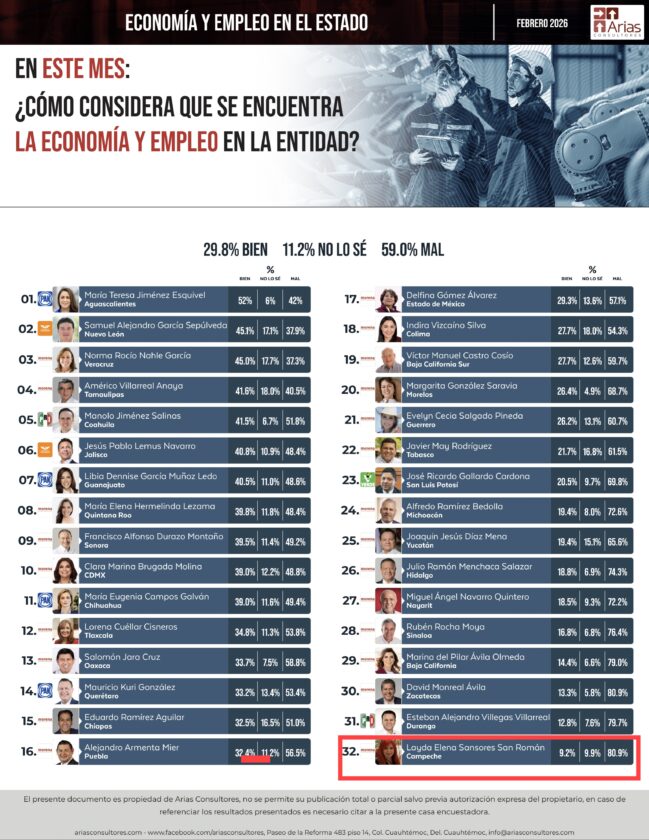 La gobernadora de Campeche, Layda Sansores San Román, registra resultados negativos en dos de los rubros más sensibles para el desarrollo del estado: la generación de empleos y la confianza de los empresarios para invertir, de acuerdo con la encuesta nacional del mes de febrero de 2026 de Arias Consultores.