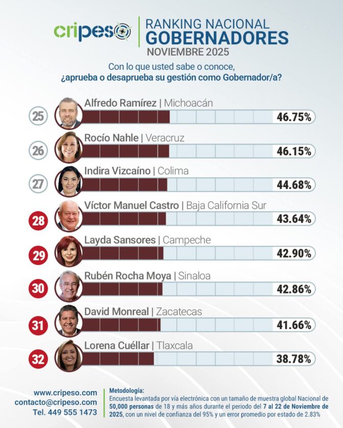 Según los datos difundidos por la encuestadora, Sansores solo supera a los gobiernos de Sinaloa, Zacatecas y Tlaxcala, todos ubicados en la parte más baja del listado. El estudio se realizó a 50 mil personas mayores de 18 años entre el 7 y el 22 de noviembre, mediante encuesta electrónica, con un nivel de confianza del 95 por ciento y un margen de error estatal promedio del 2.83 por ciento.