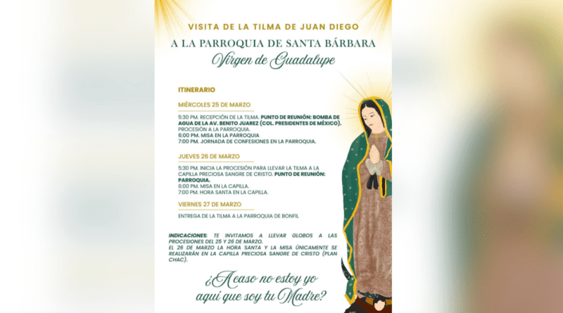 San Francisco de Campeche.- La parroquia de Santa Bárbara será sede de la visita de la tilma de Juan Diego, una de las representaciones más emblemáticas de la Virgen de Guadalupe, con un programa de actividades religiosas que se desarrollará del 25 al 27 de marzo.