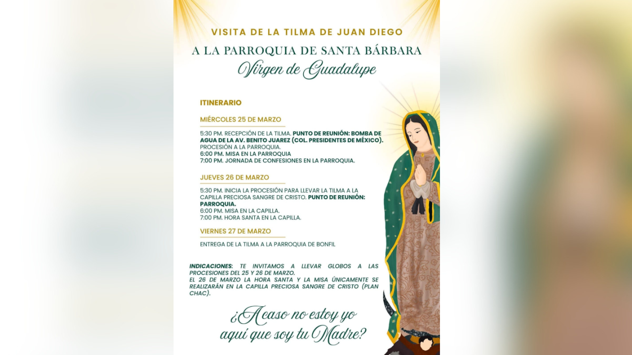 De acuerdo con el itinerario, el miércoles 25 de marzo a las 5:30 de la tarde se realizará la recepción de la tilma, teniendo como punto de reunión la bomba de agua ubicada en la avenida Benito Juárez, en la colonia Presidentes de México. Posteriormente, se llevará a cabo una procesión hacia la parroquia, donde a las 6:00 de la tarde se celebrará la misa y a las 7:00 de la noche se realizará una jornada de confesiones.