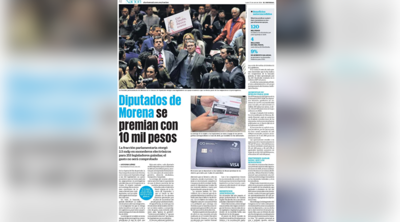 Una investigación de Antonio López en El Universal reveló un nuevo beneficio para diputados de Morena, pues en la víspera del cierre del periodo, sus 253 legisladores recibieron una tarjeta Broxel con 10 mil pesos precargados y no tendrán que comprobar el gasto.