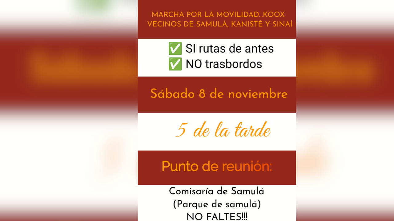 A través de una invitación que circula en redes sociales, se informó que mañana sábado 8 de noviembre a las 5 de la tarde se realizará la Marcha por la Movilidad Ko’ox, para exigir fin a los transbordos y el regreso a las rutas originales.