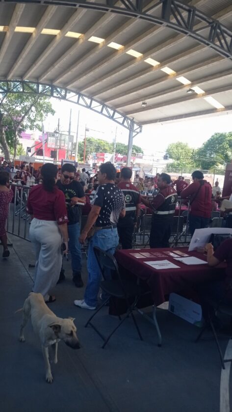 San Francisco de Campeche.- Con la cancha techada enrejada, bajo celosa vigilancia de guaruras vestidos de civil y con más funcionarios y militantes morenistas que vecinos, lo cual fue notorio por la prevalencia de playeras y chalecos color guinda, se realizó hoy en el Holoch, en la colonia Morelos, la audiencia ciudadana.